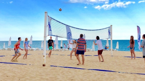 A nyilvános strand hosszú, homokos/aprókavicsos és lassan mélyülő. Fizetés ellenében napernyők és napozóágyak bérelhetők (külső szolgáltató által biztosított).