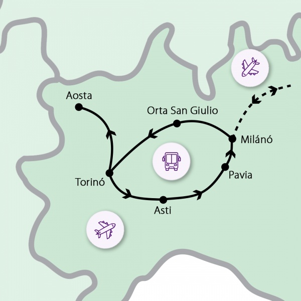 A reggeli órákban repülünk Budapestről Milánóba. Megérkezésünk után buszra szállunk és elindulunk az olasz tóvidék felé. Úticélunk egy igazi rejtett gyöngyszem, a Lago d'Orta tó. Közvetlenül a tóparton helyezkedik el Orta San Giulio városka. Sétálunk az aranyos település szűk utcáiban, majd kimegyünk a tópartra, ahonnan indulnak a kishajók Isola San Giulio szigetére. Mi is áthajózunk, és a parányi szigeten található bazilikába belépve elámulunk annak díszítettségén. Visszahajózásunk után Torinóba megyünk, ahol elfoglaljuk szállásunkat (3 éj).