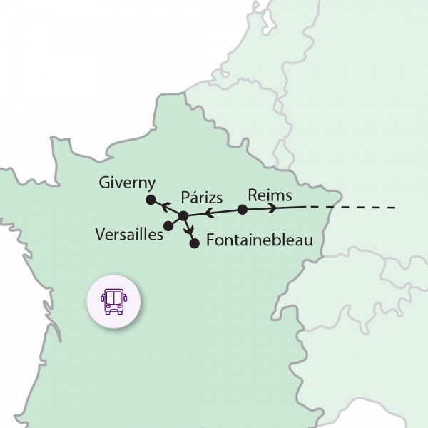 Reggeli után, akik el akarnak menni az Eurodisney-be, azok ezt a napot ott tölthetik. Kiutazás HÉV-vel. Az idegenvezető elmagyarázza az odajutás módját. Nekik egésznapos szabad szórakozás a csodálatos játékparkban. (Párizs?ban a programok /napok/ sorrendje változhat, ha valaki az Eurodisneybe akar menni, az online jegyvásárlás előtt egyeztessen irodánkkal vagy az idegenvezetővel). A többieknek fakultatív programot javaslunk Párizs környékére. Az első látnivalónk a festő, Claude Monet villájának megtekintése lesz Givernyben. A művész ebben a villában alkotott 11 évig. Itt egy csodálatos japán vízikertben és virágoskertben gyönyörködhetünk. Délután egy, az UNESCO Világörökség Listáján is szereplő fantasztikus kastélyt keresünk fel, a Fontainebleau-kastélyt, amely nemcsak azért híres, mert több király született itt, hanem mert a belső kialakítása is meseszép. Fakultatív kirándulás 2 belépővel (jelentkezés a helyszínen): 50 EUR. Aki nem választja a fakultatív programot, annak szabadprogram Párizsban. Ekkor a több tucat múzeum valamelyikét tekinthetik meg, vagy séta közben magukba szívhatják a belváros egyedi hangulatát. Szállás, vacsora a szokásos módon.