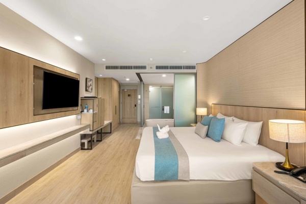(1 pótágy gyermeknek kérhető), kb. 33 m?, légkondicionált, félnyitott üvegfürdőszoba (kád és zuhanyzó, WC, hajszárító, kozmetikai csomag, köntös, papucs), vezeték nélküli internet, műholdas TV, telefon, széf, kávé-/teafőző készlet, erkély vagy terasz (asztal és napozóágyak), tengeri kilátás, felár ellenében minibár.