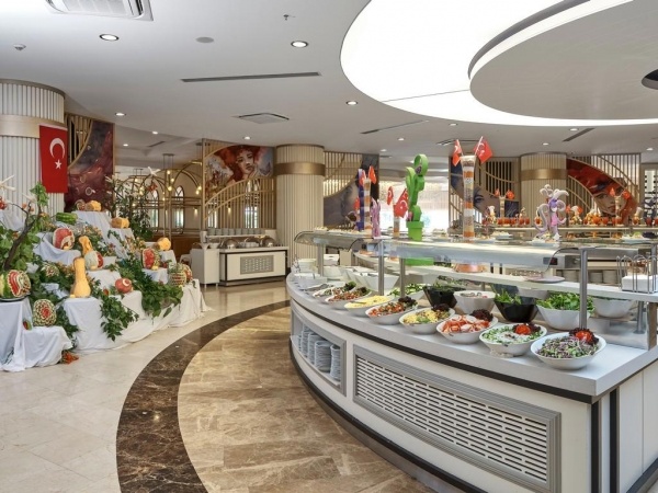 ELLÁTÁS: all inclusive o svédasztalos reggeli, ebéd és vacsora o késői reggeli o délutáni és éjszakai snackek o kávé, tea és sütemények o fagylalt o a'la carte éttermek (török, ázsiai, olasz) - a tartózkodás alatt 1 alkalommal, előzetes foglalással o helyi alkoholos és alkoholmentes italok o minibár o térítés ellenében: import és prémium alkoholos/alkoholmentes italok o palackozott italok o friss gyümölcslevek o italok a diszkóban o szobaszerviz