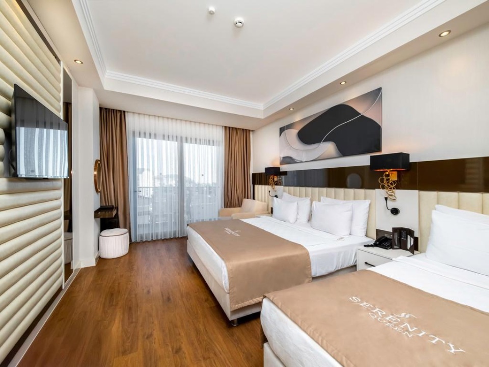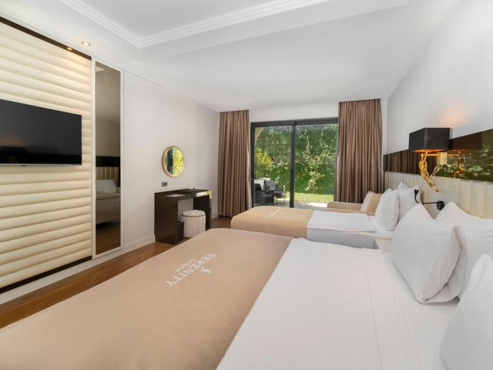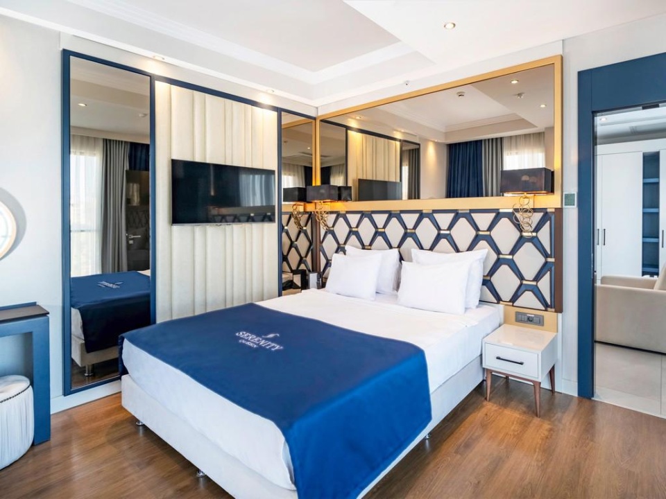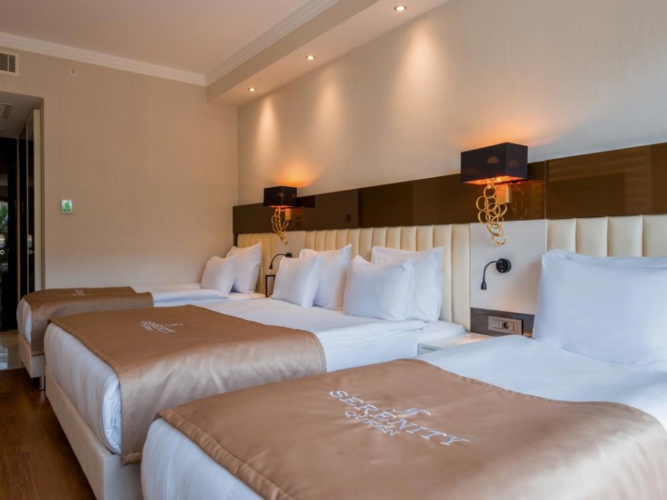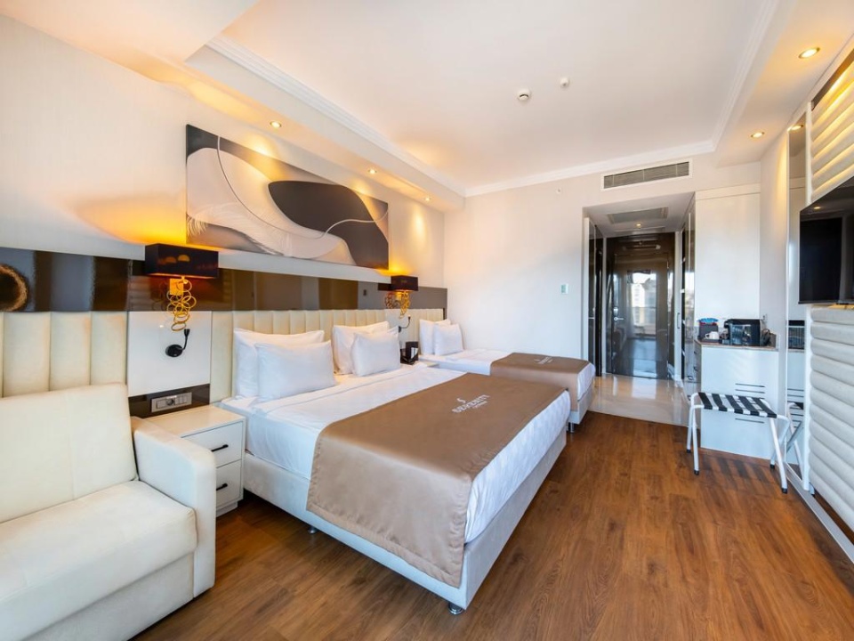SZOBÁK: 233 szoba • erkély • központi légkondicionálás • hajszárító • telefon • műholdas TV • széf • minibár • kávé- és teafőző szett • papucs • wifi• deluxe szobák: kb. 24–30 m², max. 3 vagy 3+1 fő részére, tengerre vagy kertre néző kilátással
