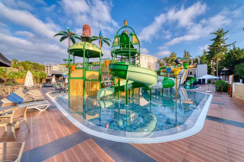 SZOLGÁLTATÁSOK:• medencék napernyőkkel és napozóágyakkal • csúszdák • főétterem • bárok • nappali és esti animációs programok • élőzene • amfiteátrum • fitneszterem • törökfürdő • szauna • gőzfürdő • asztalitenisz • darts • step aerobik • zumba • pilates • vízi torna • vízilabda • TV-sarok