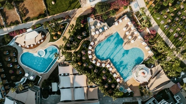 Fekvése: a St. George Beach Hotel & Spa Resort kiváló helyen, Paphos üdülőövezeti részén, közvetlenül Chloraka tengerpartján található, 6 km-re Paphos központjától és 7 km-re a középkori vártól, a híres festői kikötőtől és az ősi mozaikoktól. Ez a rendkívül színvonalas, 260 szobás, elegáns, prémium all-inclusive tengerparti szálloda és wellness-üdülőhely, kizárólag 16 éven felüli felnőt vendégeket fogad. A szálloda körüli partszakasz sziklás azonban a szálloda előtti csodálatos homokos, helyenként kavicsos strand található, egzotikus pálmafákkal körülvéve, mely mögött feltárul a Földközi-tenger szépsége és romantikája. A strand a szépen gondozott kerten keresztül érhető el. A térség egyik legszebb strandja a Coral Bay kb.5 km-re (taxival ~15 euró) található. Buszmegálló a szálloda közelében.