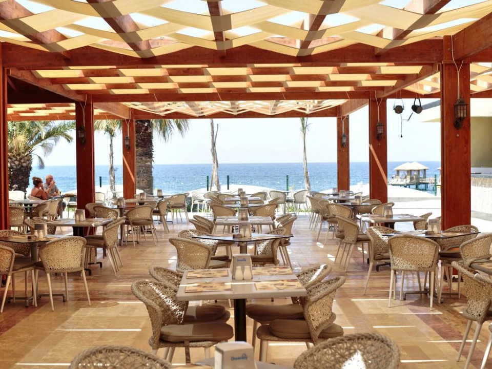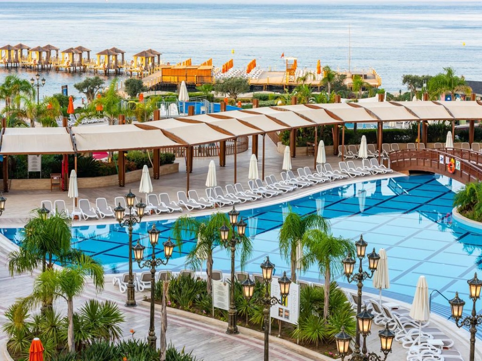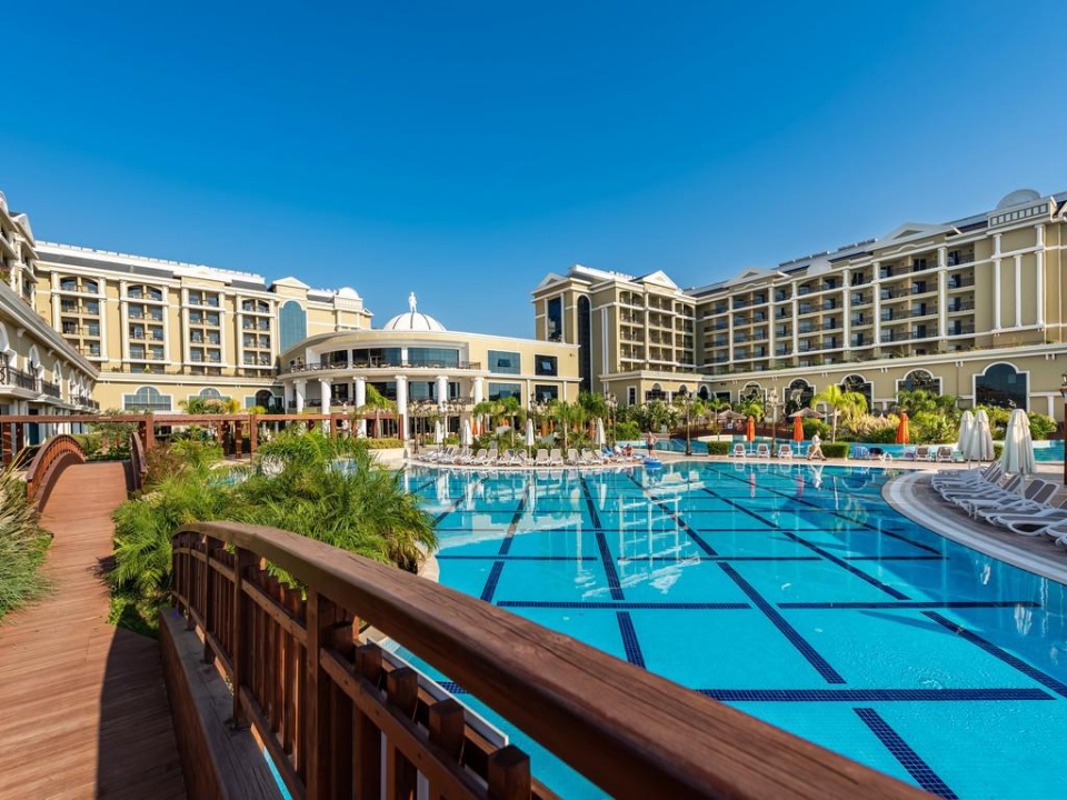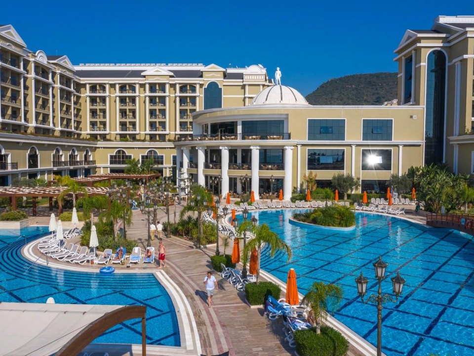 Szállás leírás: Az 5*-os, kizárólag 6 emeletes főépületből, összesen 470 szobával rendelkező, a központtól 52 km-re, közvetlenül a kavicsos tengerparttól helyezkedik el.