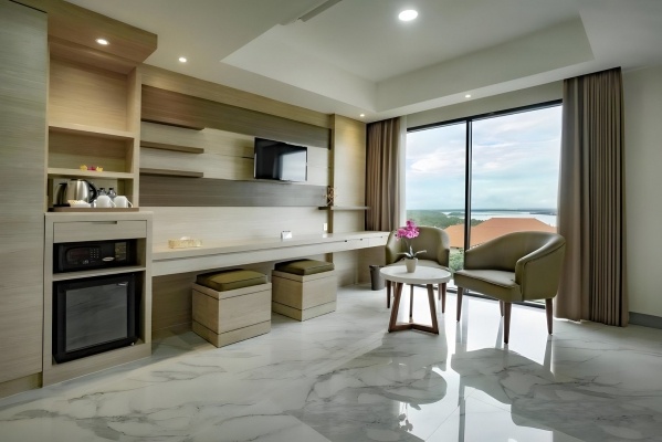 A tengerre néző apartman körülbelül 45 m?-es, két fő számára kínál tágas, kényelmes környezetet. A légkondicionált apartman fürdőszobája zuhannyal, WC-vel, hajszárítóval, kozmetikai készlettel, köntössel és papuccsal felszerelt. A vendégek számára vezeték nélküli internet, műholdas televízió, telefon, széf, kávé-/tea készlet és kis hűtőszekrény áll rendelkezésre. Előzetes foglalás esetén ingyenes kiságy is biztosítható 2 év alatti gyermeknek. Az apartman erkélyéről gyönyörű kilátás nyílik a tengerre.
