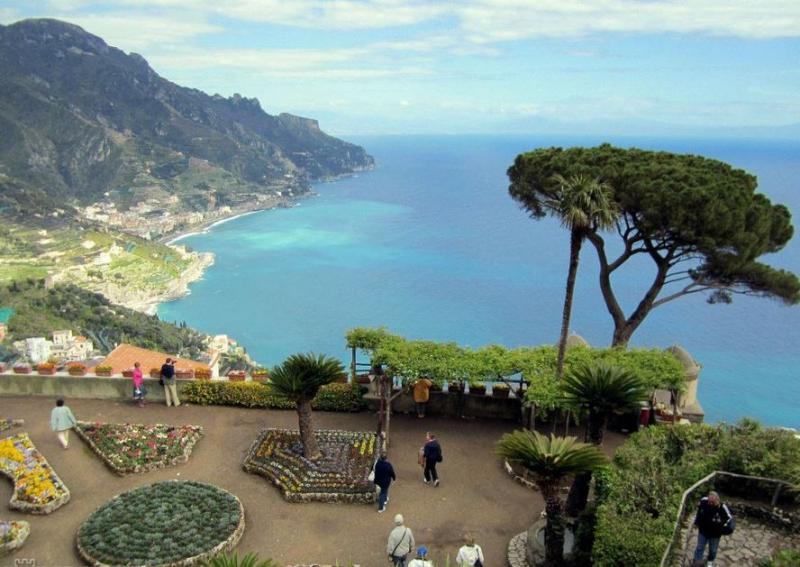 Ezt követően ismerkedés az Amalfi felett 350 méterrel található Ravello városával. Ravello két nagy nevezetessége a középkori Rufolo-palota (gyönyörű mediterrán kerttel) és a Cimbrone-villa. Ez utóbbi parkjában található az a kilátópont, mely szinte a tenger felett lebeg. Az innen nyíló panoráma az Amalfi környéki partvidékre leírhatatlan látvány (Itália talán legszebb panorámája).