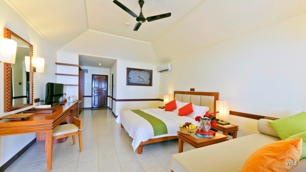 SZOBÁK: villa: 2 fős (1 pótágy lehetőséggel felnőttnek vagy 2 gyermeknek), kb. 54 m2, egyedi vezérlésű légkondicionálás, mennyezeti ventilátor, fürdőszoba (kád, wc; hajszárító), kültéri zuhany, vezeték nélküli internet, műholdas televízió, telefon, széf, kávé/tea készlet, minibár (fogyasztás szerint fizetendő), palack víz/fő (naponta feltöltve); terasz (napozóágyak); water villa: 2 fős (1 pótágy lehetőséggel), kb. 77 m2, felszereltség mint a villa szobában; terasz (napozóágyak); deluxe beach villa: 2 fős (1 pótágy lehetőséggel), kb. 150 m2 (a medencével együtt), felszereltség mint a villa szobában, plusz: privát medence és közvetlen kijárat a strandra; terasz (napozóágyak); szobák: water villa és deluxe beach villa felár ellenében.