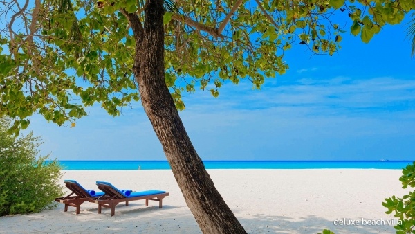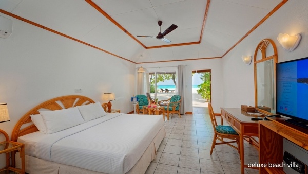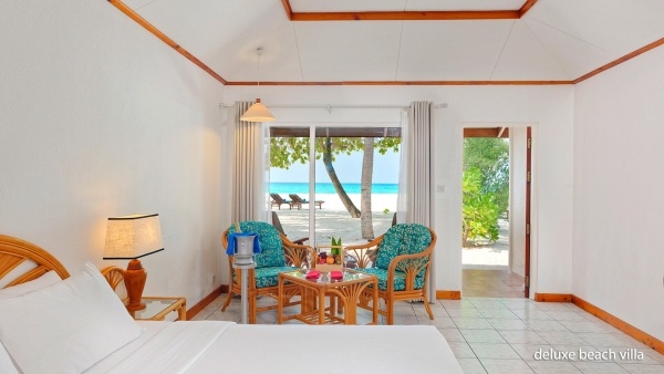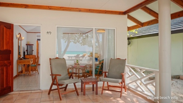A deluxe tengerparti villa kb. 52 m? alapterületű, két fő számára ideális, és egy pótágyat biztosít felnőttnek vagy két gyermeknek. A villa egyénileg szabályozható légkondicionálással rendelkezik. A fürdőszobában kád, WC és hajszárító található, valamint külső zuhany is rendelkezésre áll. A vendégek számára műholdas televízió, telefon, minibár (naponta vízzel feltöltve), széf, kávé- és teafőző készlet, valamint ingyenes kiságy áll rendelkezésre 2 év alatti gyermekek számára, amelyet előzetesen kell igényelni. A terasz asztallal és székekkel van felszerelve, és tengerre néző kilátást nyújt, bár a kilátás korlátozott lehet a szállás függvényében.