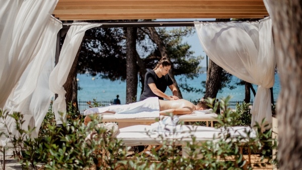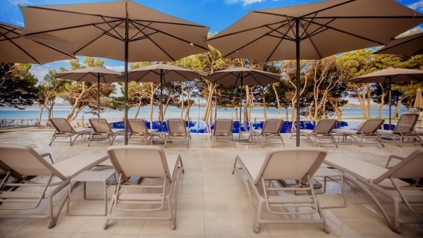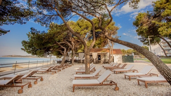 A szálloda közelében található nyilvános strandok mindegyike köves, enyhe lejtéssel a tenger felé. A strandok Kék Zászlóval kitüntetettek, biztosítva a tisztaságot és biztonságot. A vízbe lépéshez ajánlott védőcipőt viselni. A strandok különböző jellegűek: van, ahol betonmólók segítik a fürdőzést, és ahol a sziklás, köves részek mellett a tenger könnyen megközelíthető. A látogatók napernyőket és napozóágyakat vehetnek igénybe, de ezekért térítés ellenében kell fizetni. A strandok mindössze kb. 50 m-re találhatók a sétánytól, így könnyen elérhetők a vendégek számára.