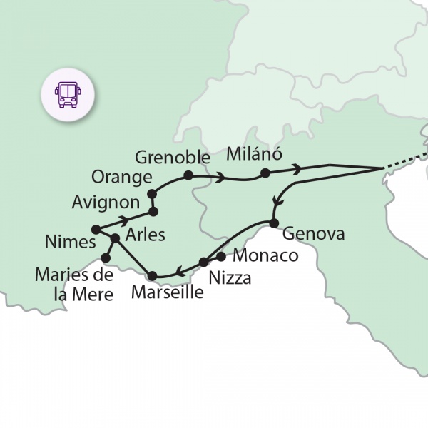 Reggel Orange városába indulunk, miközben utunkat végig a mediterrán növények látványa kíséri. A városba érve megtekintjük a Diadalívet, majd a Világörökség Listáján is szereplő ókori színházat és annak környékét. Folytatjuk utunkat a Francia-Alpok legismertebb városába, a téli olimpiának otthont adó Grenoble-be. A magas, több mint 3 000 méteres hegycsúcsok látványa felemelő élmény, a nyári kánikulában feltűnő hófoltok pedig kontrasztot adnak a tájnak. A városban megnézzük a katedrálist, az Igazságügyi Palota épületét, Stendhal szülőházát és sétálunk a központban is. Ezt követően lehetőség nyílik egy látványos felvonózásra. A kabin gyorsan emelkedik a kilátóhoz, és már menet közben lenyűgöző panoráma nyílik a városra, az Is?re folyóra és a környező hegyekre, a hegytetőről pedig teljes pompájában élvezhetjük a tájat. Programunk befejeztével a többezer méteres csúcsok között kanyarogó úton, a híres Fréjus-alagúton áthaladva érkezünk Olaszországba, ahol elfoglaljuk szállásunkat.