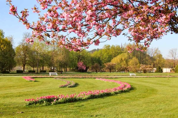 A bejárat után rögtön balra tekintve azonnal mesés látványban lesz részünk: a nyíló tulipánok mellett kanyargó ösvények, árnyékoló sátrak, üvegházak, és a távolban a gyönyörű havas hegyek, a Karavankák. A 85 hektáros területen a tulipánokon kívül 1000 rózsafajta, a télikertben kaktusz és orchideagyűjtemény majd 5000 fa várja a turistákat. Festői környezetben, patakok és tavak között, hegyekkel körbevéve sétálgathatunk a milliónyi virág között. a kicsiket játszótér is várja, de ajándékbolt, kávézó, kisvonat is hozzájárul a szórakozáshoz.