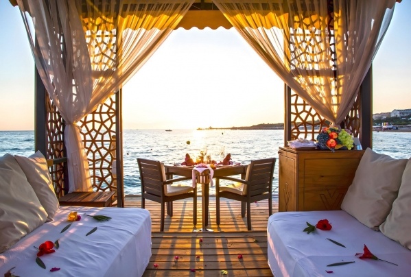 Éttermek: fő étterem Deep Blue - büfé formájában kínált ételek, török és nemzetközi konyha, tematikus vacsorák 6 a la carte étterem: Bistro L'atelier Du Chef - nemzetközi konyha, Longhorn Steak House - nemzetközi konyha, Beluga Fish - mediterrán konyha, Kaiseki Far East - kínai konyha, Kaftan Kebab House - török konyha, Radika Akdeniz Restoran - mediterrán konyha az éttermekben elérhető menü és gyerekfotelek 2 snack bár, köztük a Cydonia Food Corner a medencénél 3 bár: Howlite a lobban, Tamarix a medencénél, Kék All inclusive reggeli (7.00-10.00), ebéd (12.30-14.00) és vacsora (19.00-22.00) büfé formájában a kijelölt étteremben késői reggeli (10.00-11.00) büfé formájában a kijelölt étteremben snackek (12.30-16.00) kijelölt helyen kávé és sütemény (14.30-18.00) kijelölt helyen éjjeli snackek (24.00-8.00) büfé formájában kijelölt étteremben helyi alkoholmentes italok és alkoholok kijelölt helyen (24h).